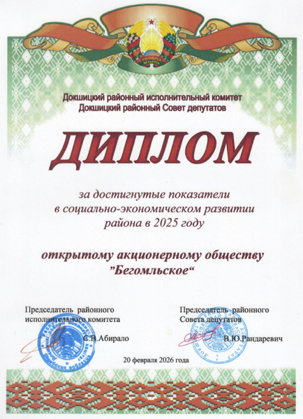 Дипломом районного исполнительного комитета и районного Совета депутатов награжден коллектив ОАО «Бегомльское» - дочернего предприятия ОАО «Промагролизинг». Награда вручена за достигнутые показатели в социально-экономическом развитии в 2025 году.