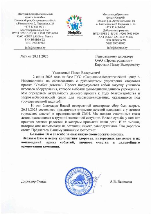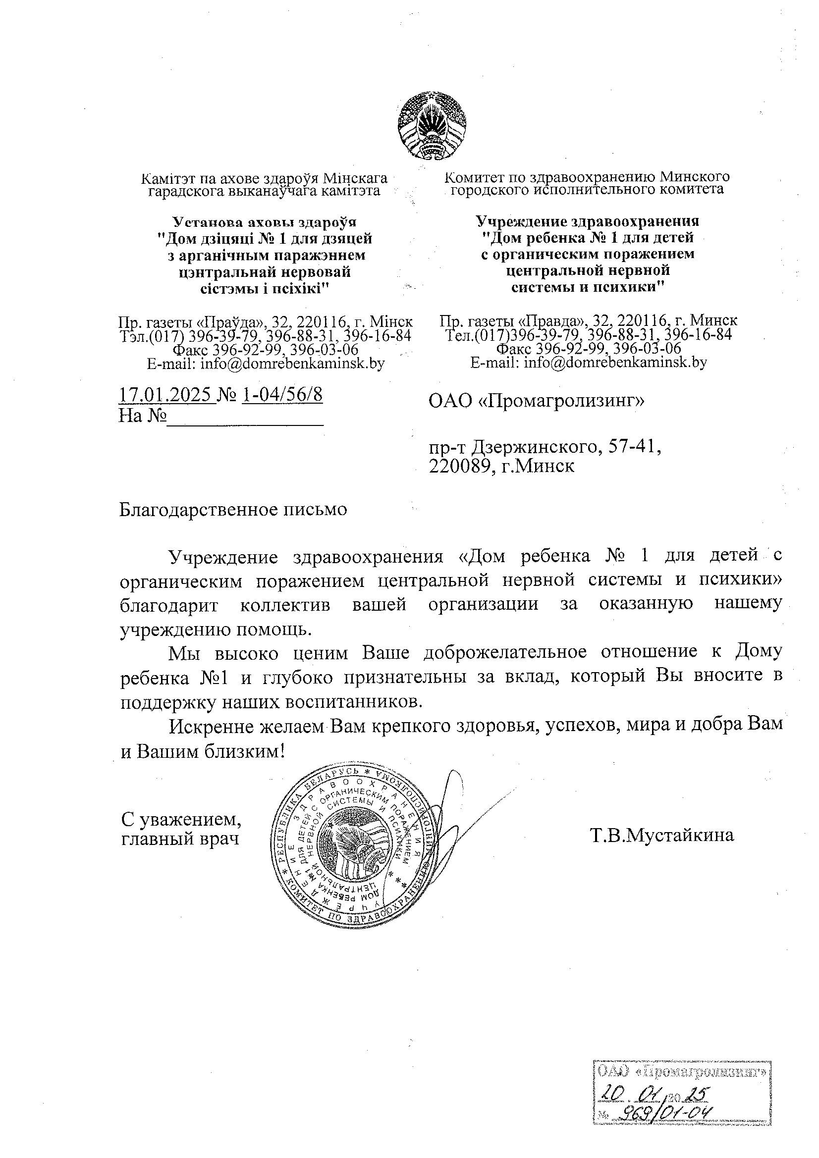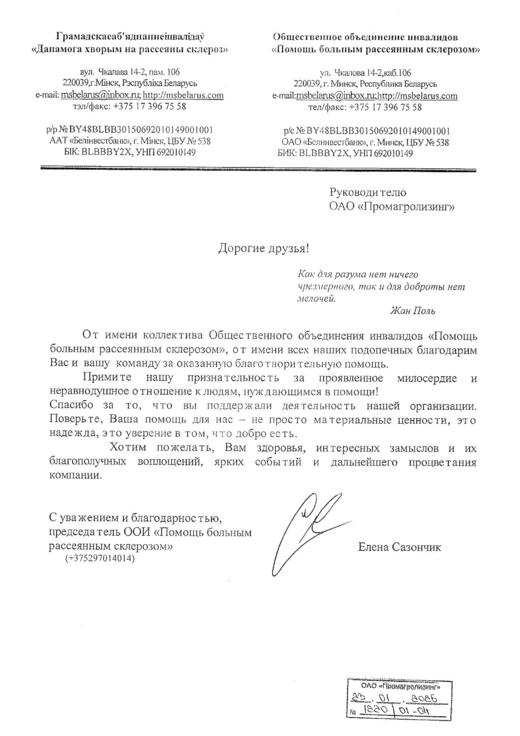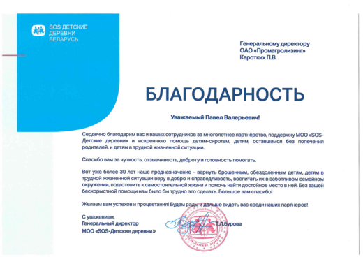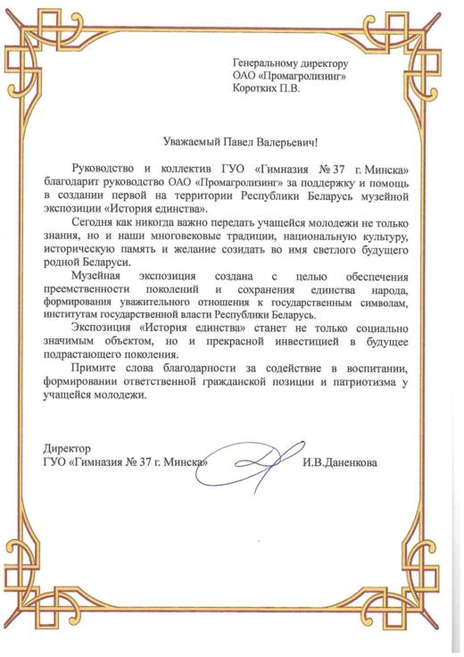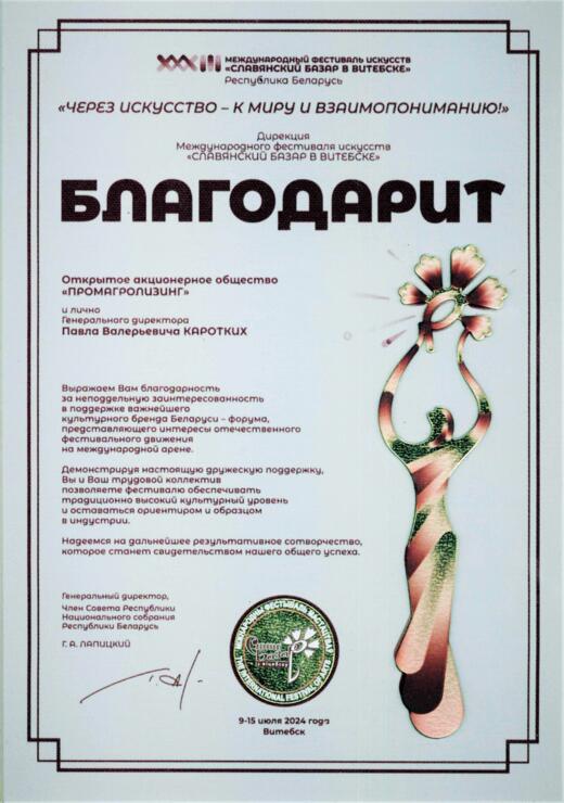 Благодарность от Дирекции Международного фестиваля искусств "СЛАВЯНСКИЙ БАЗАР В ВИТЕБСКЕ"