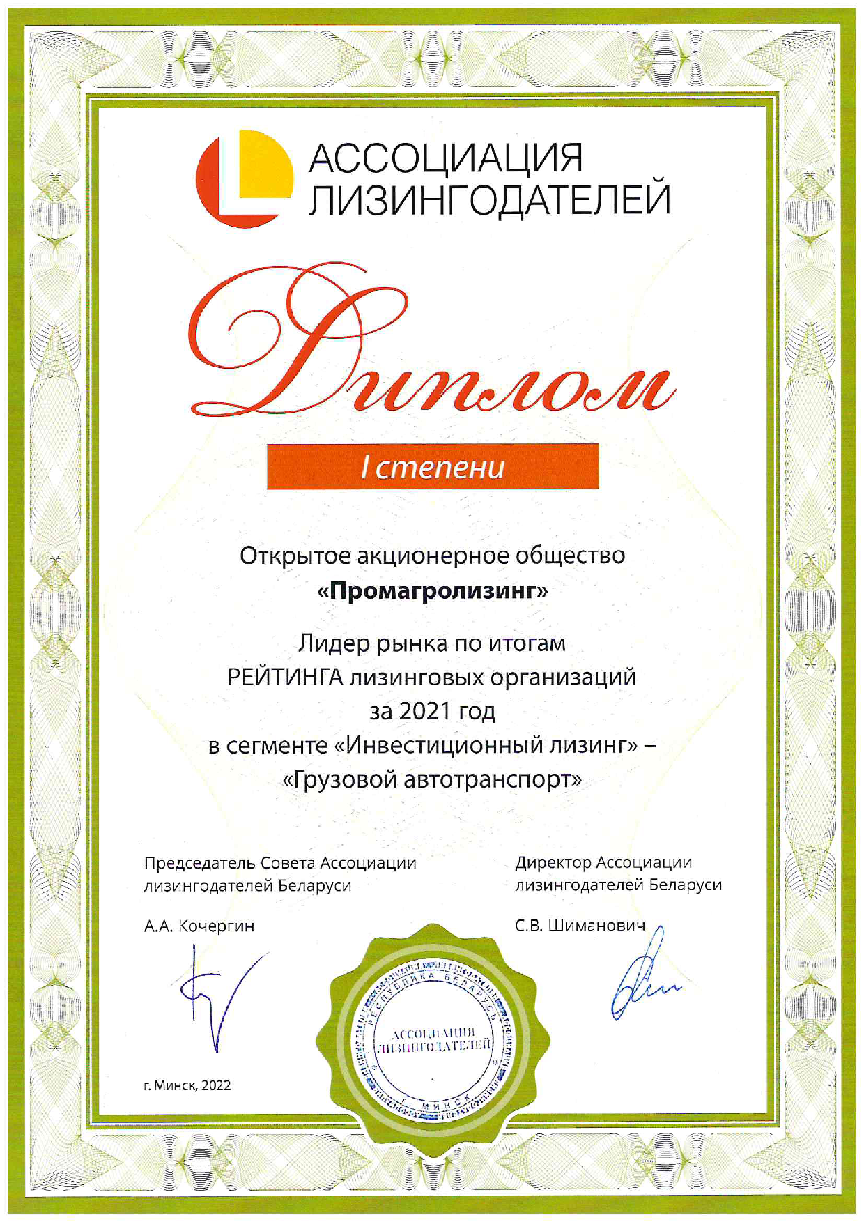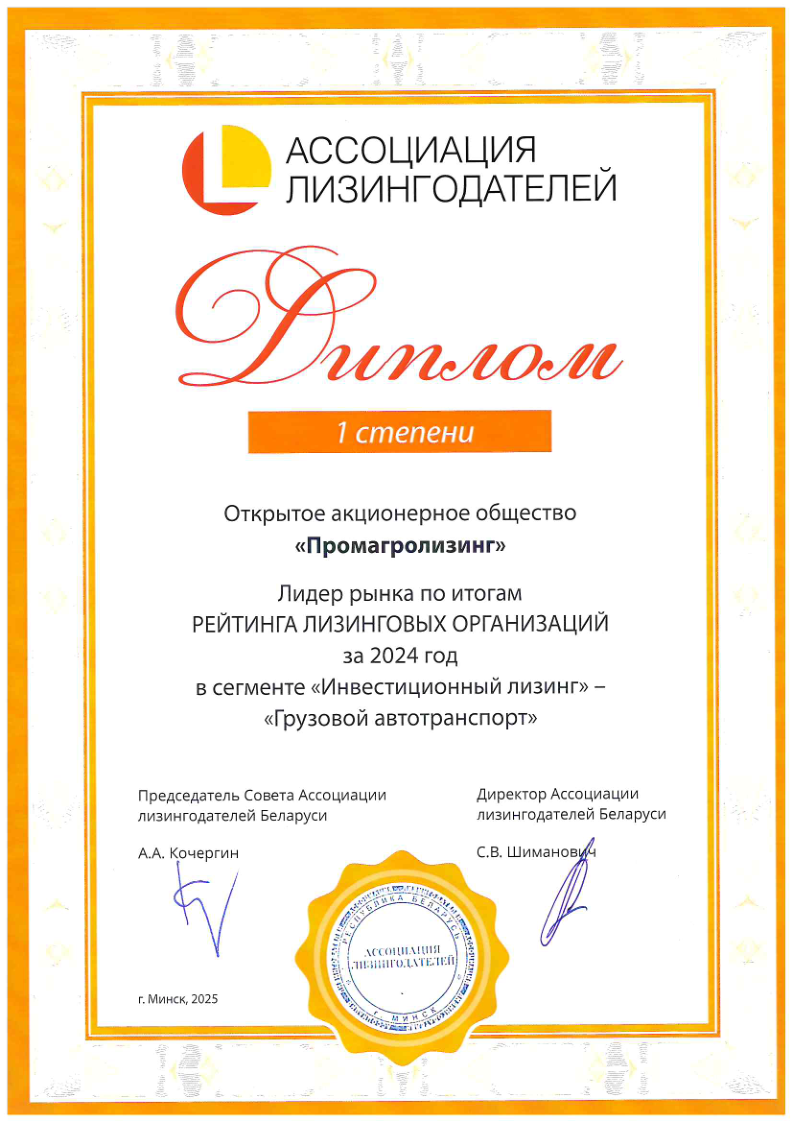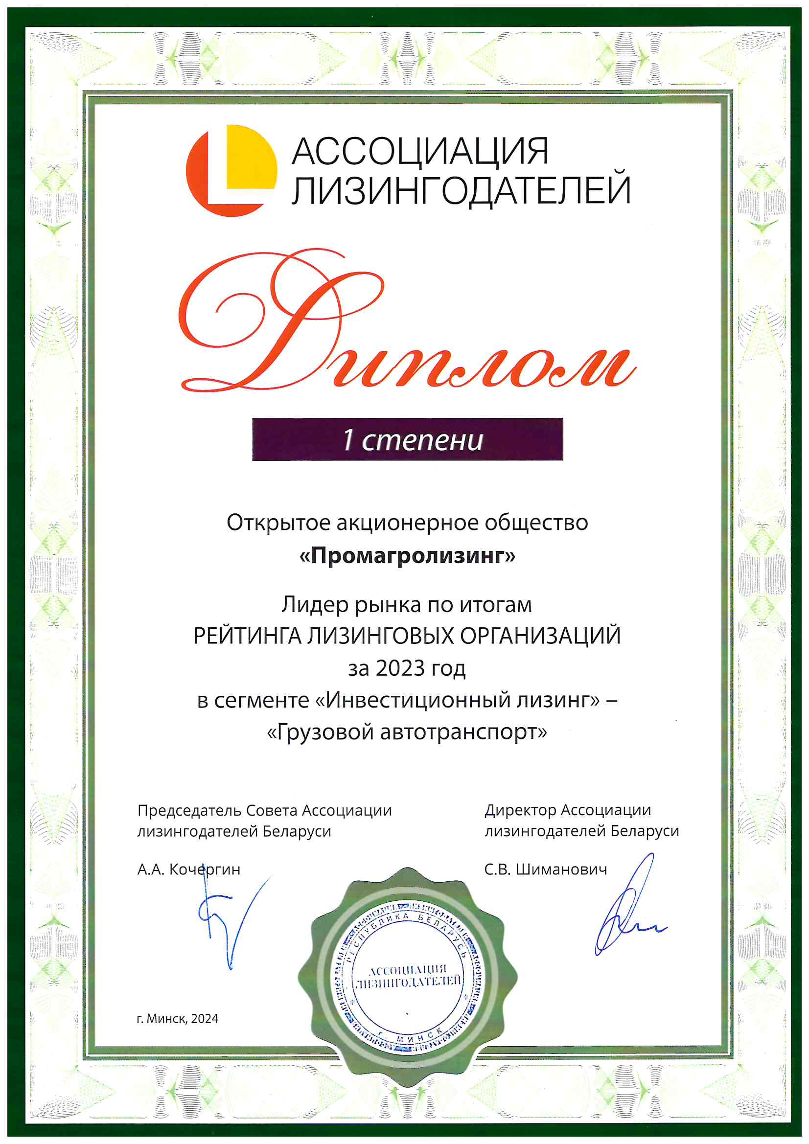 Диплом I степени ОАО "Промагролизинг" - Лидер рынка по итогам РЕЙТИНГА лизинговых организаций за 2024 год в сегменте "Инвестиционный лизинг" - "Грузовой автотранспорт"