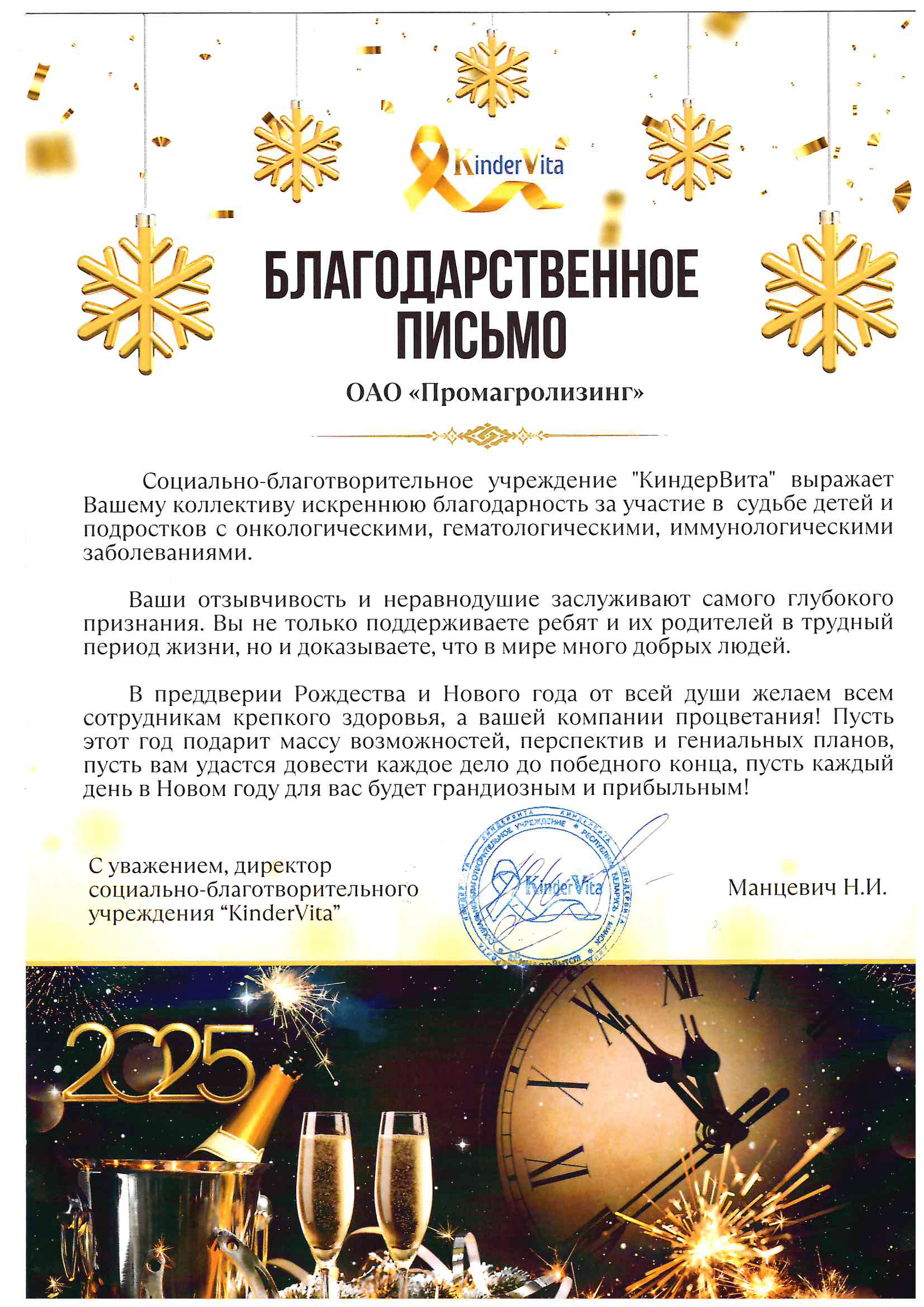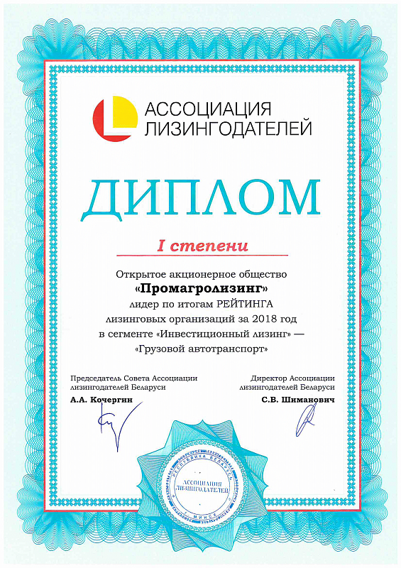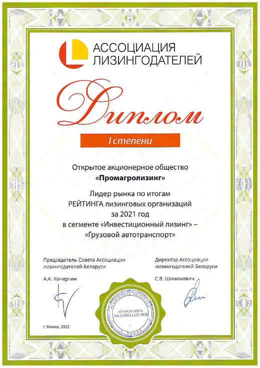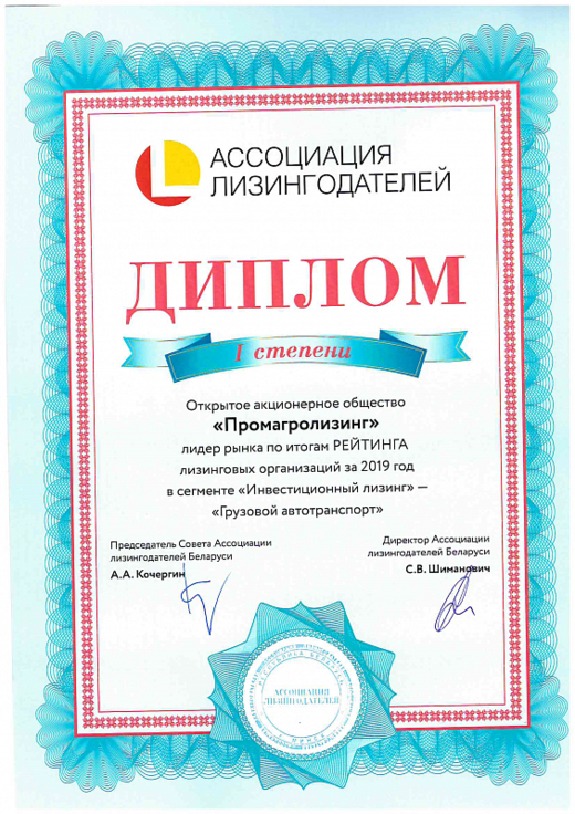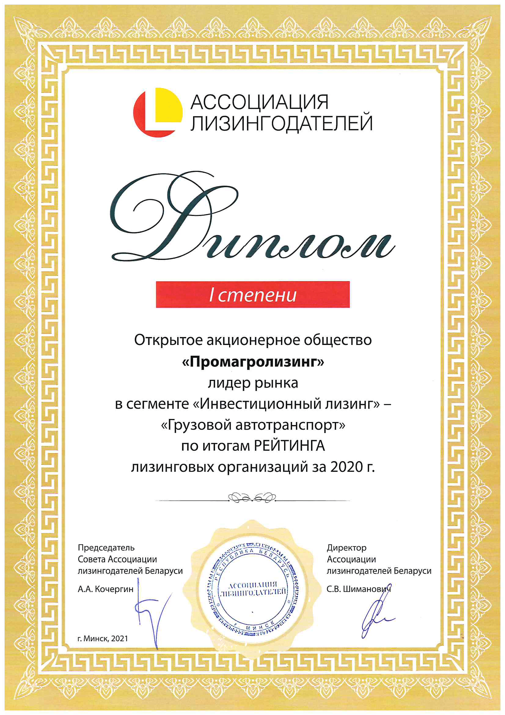 Диплом I степени ОАО "Промагролизинг" - Лидер рынка по итогам РЕЙТИНГА лизинговых организаций за 2024 год в сегменте "Инвестиционный лизинг" - "Грузовой автотранспорт"