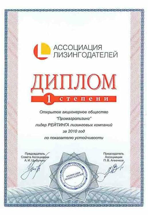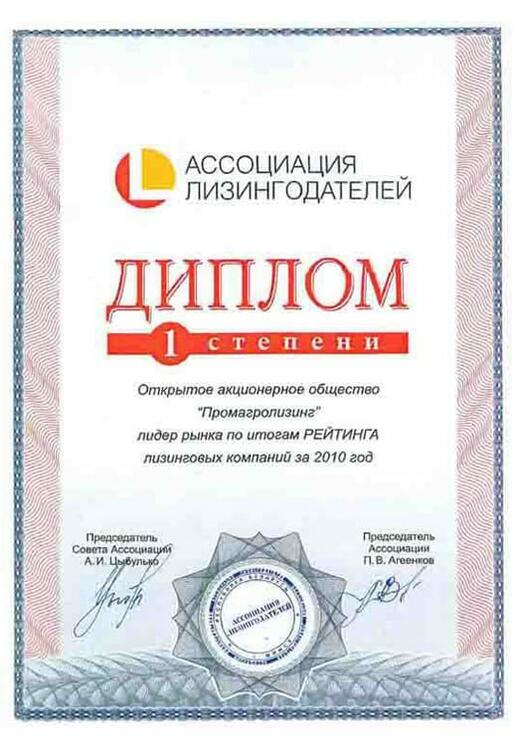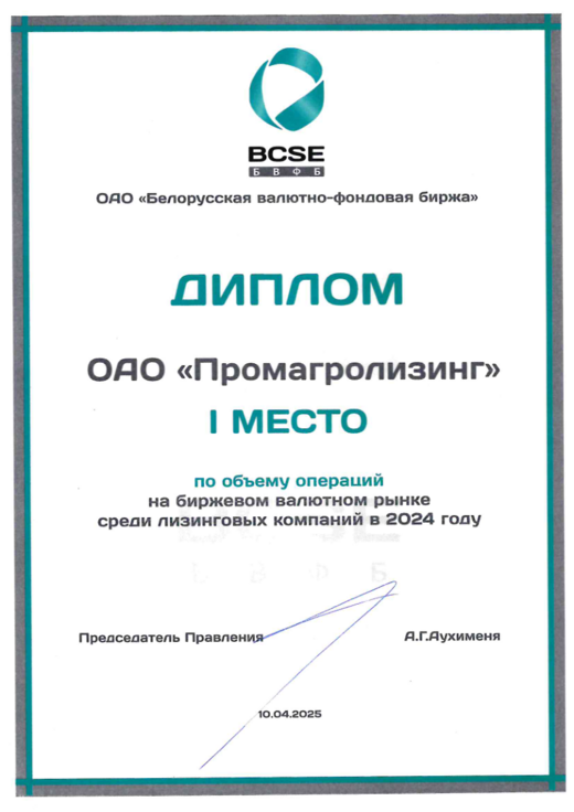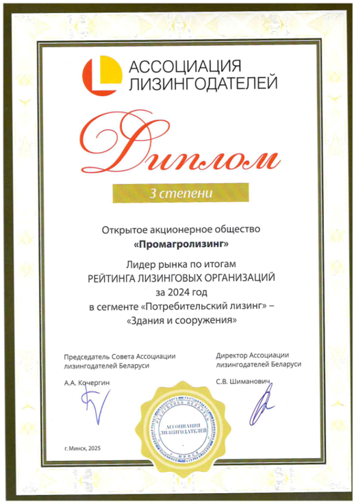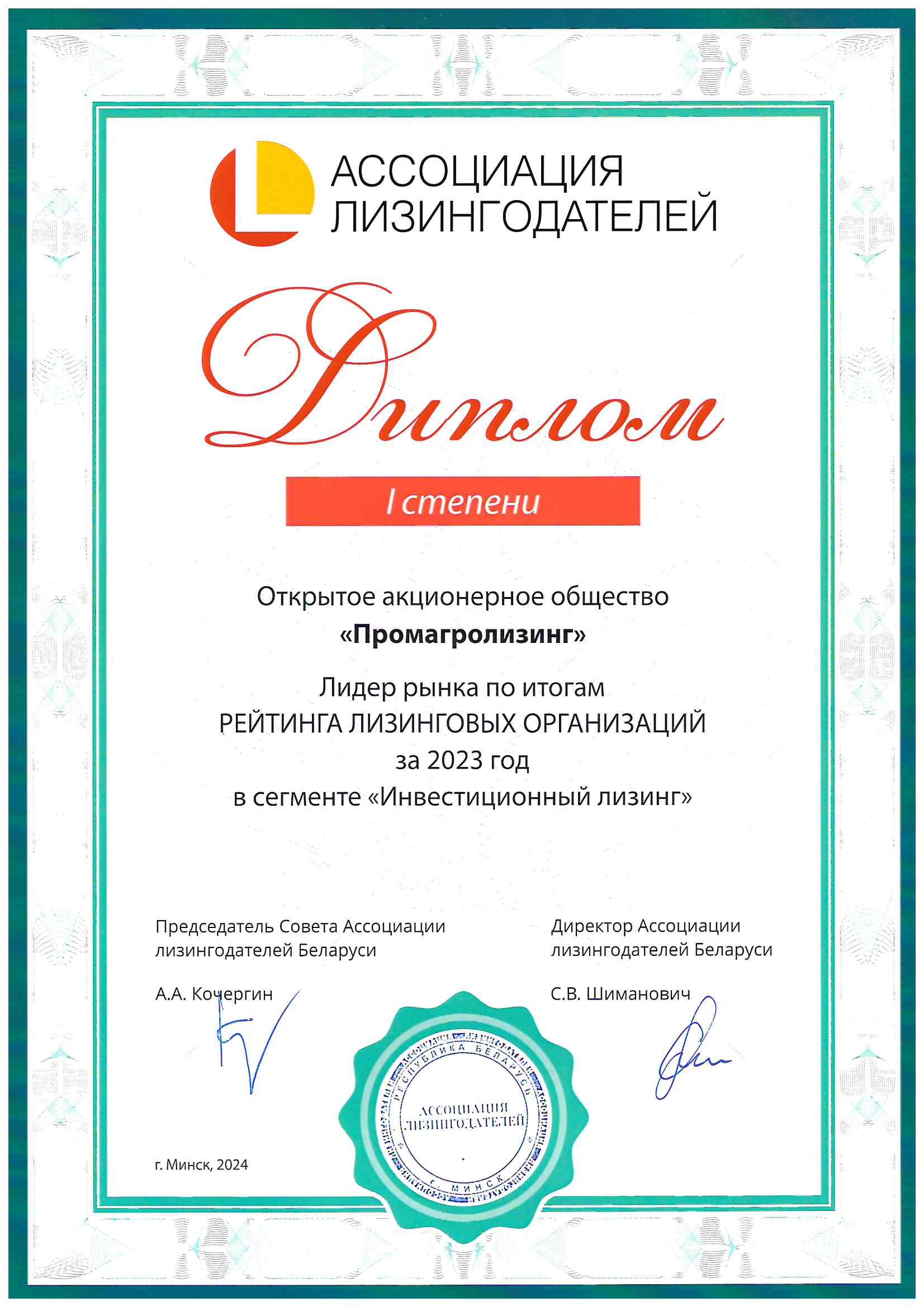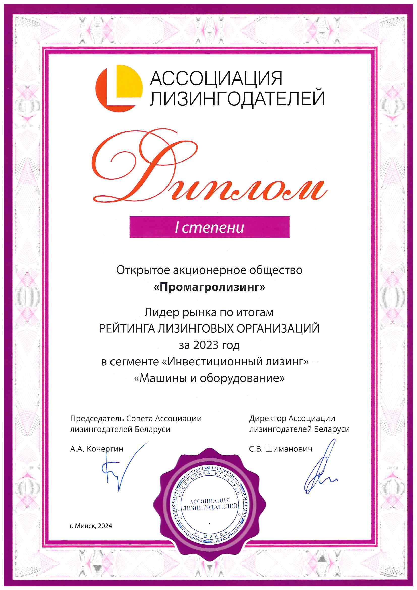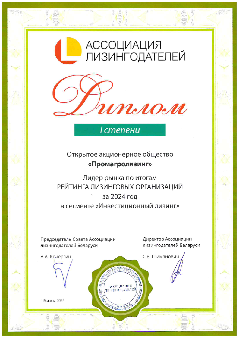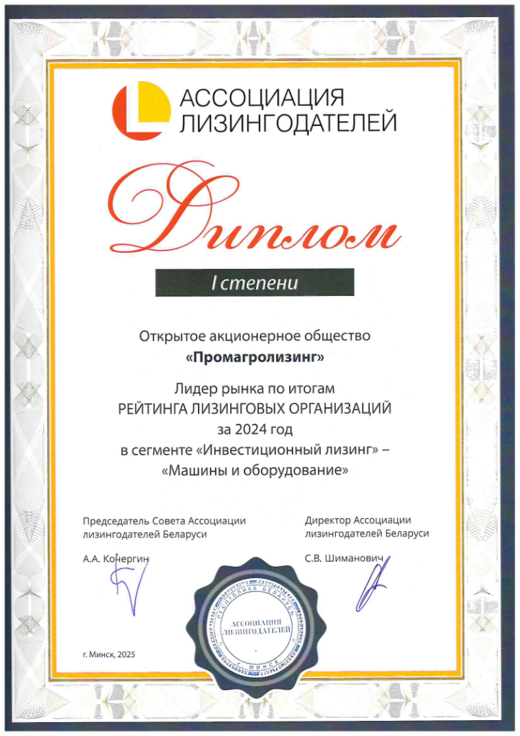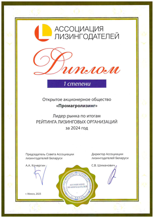 Диплом I степени ОАО "Промагролизинг" - "Лидер рынка по итогам рейтинга лизинговых организаций за 2024 год"