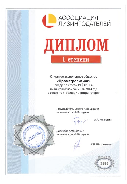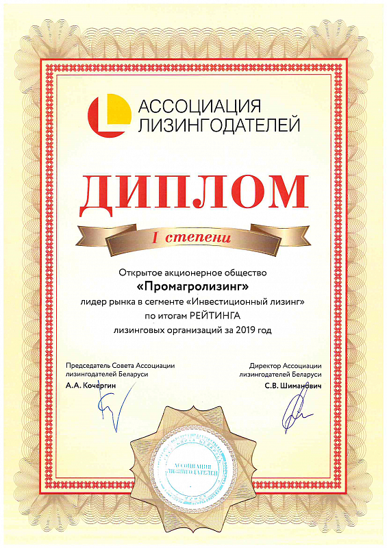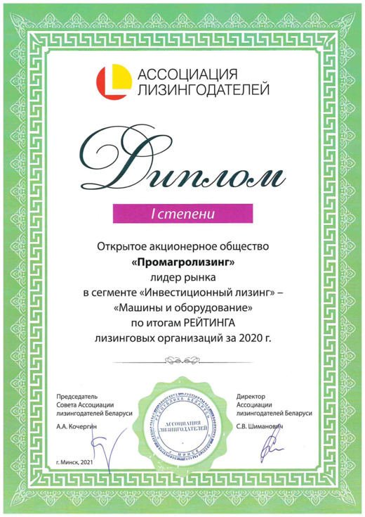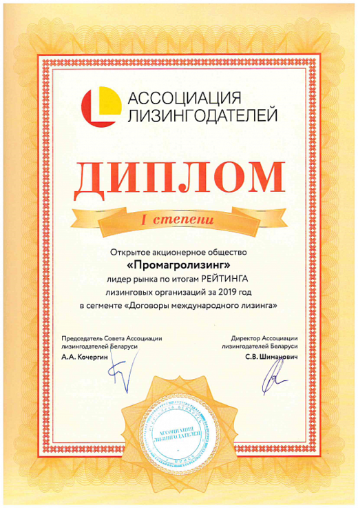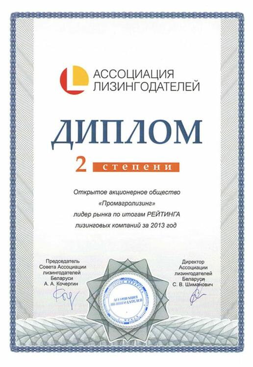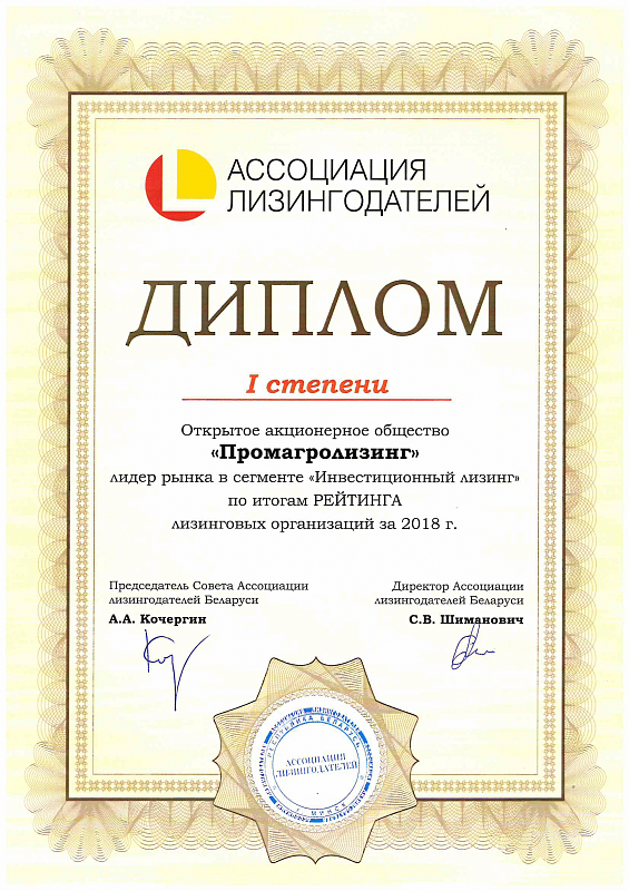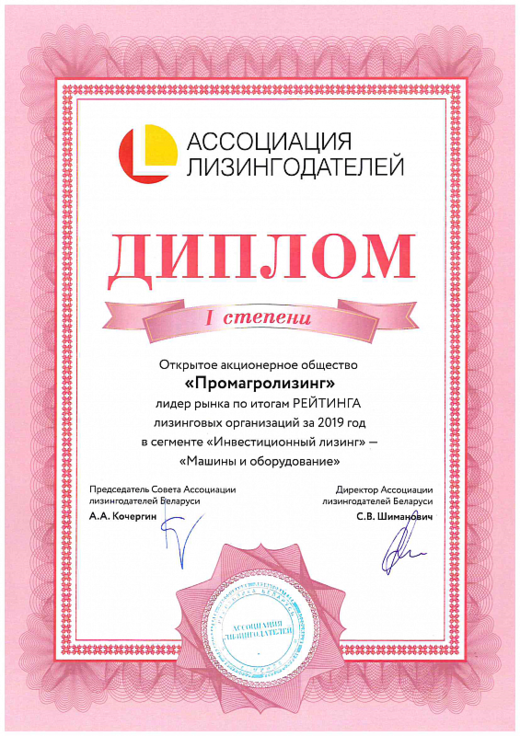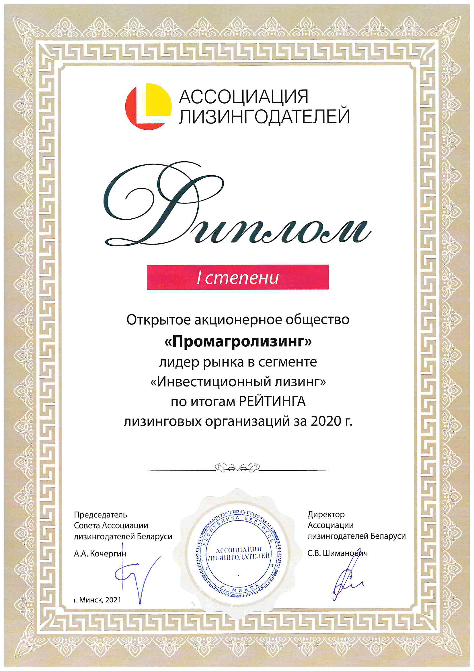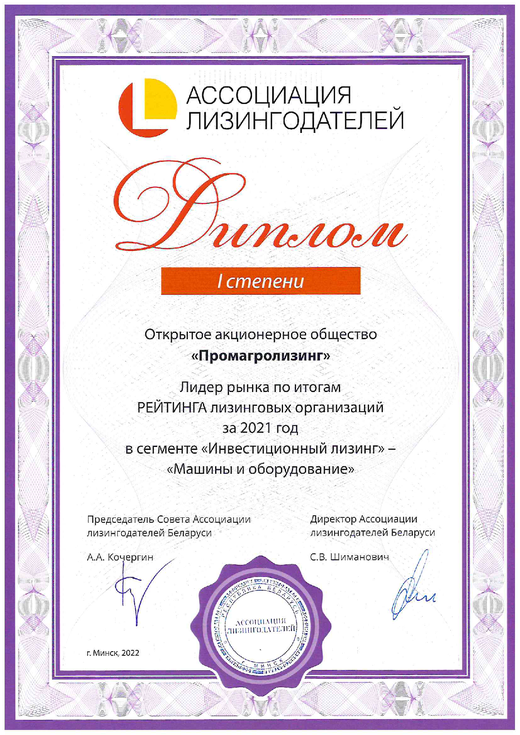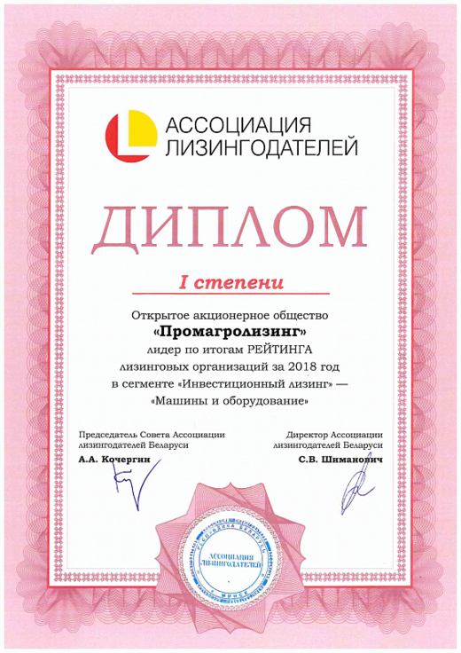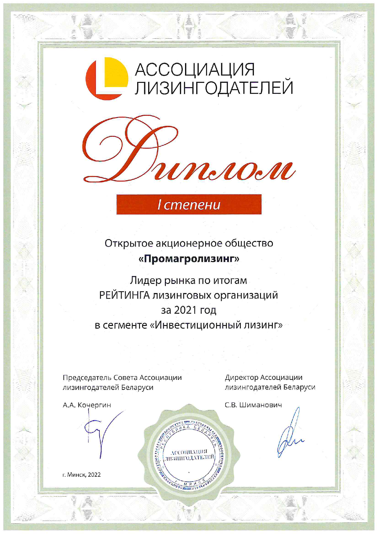 Диплом I степени ОАО "Промагролизинг" - "Лидер рынка по итогам рейтинга лизинговых организаций за 2024 год"