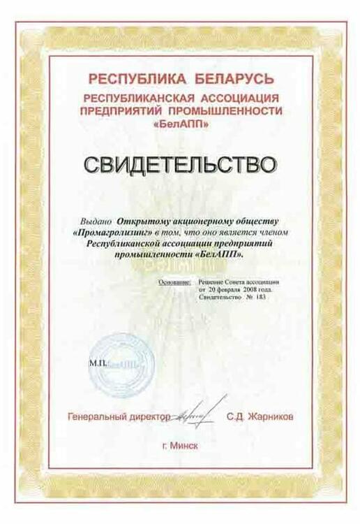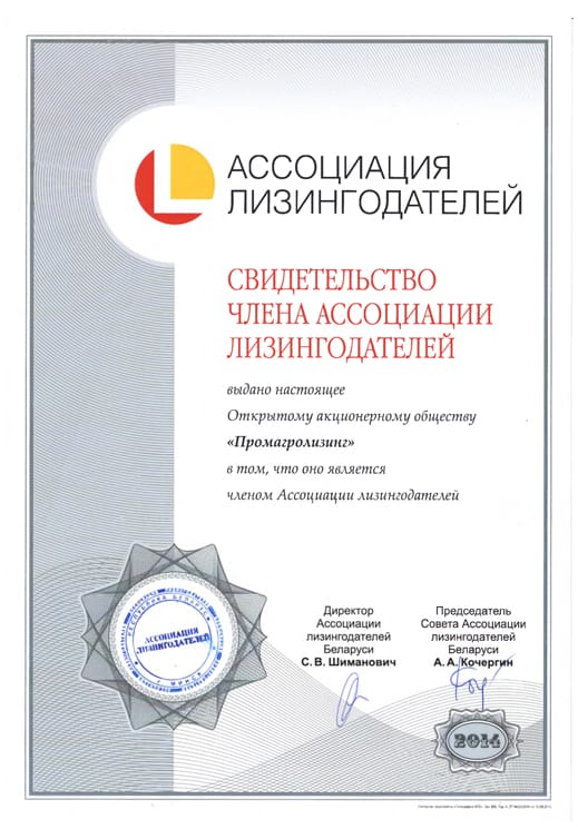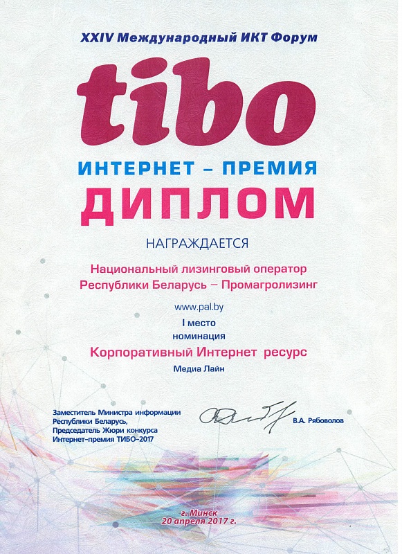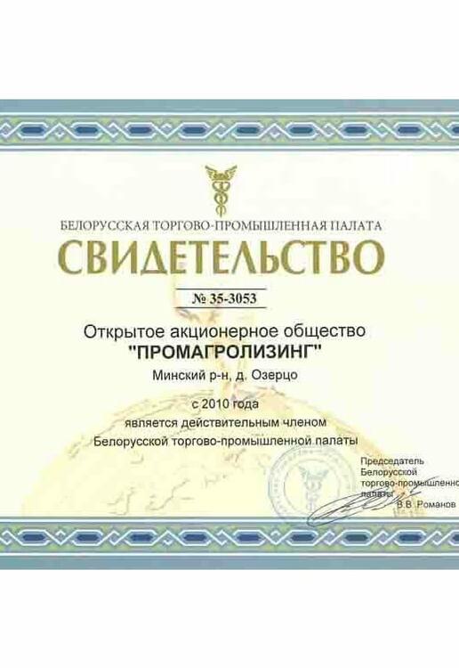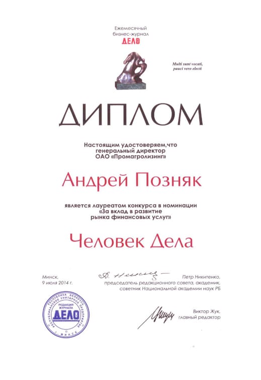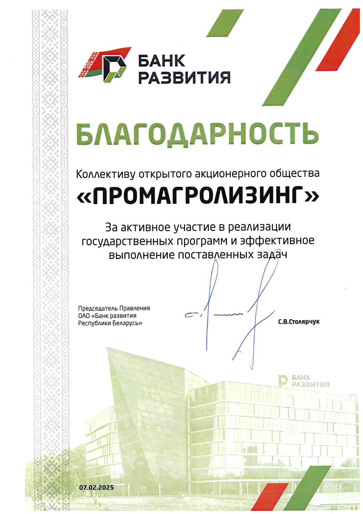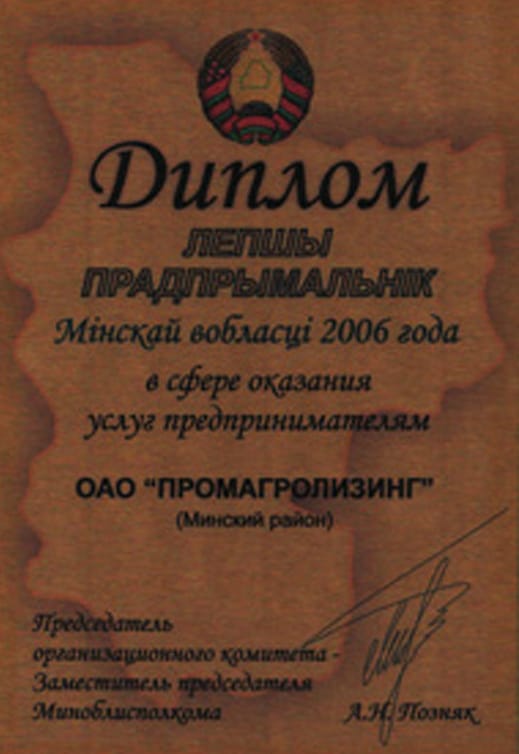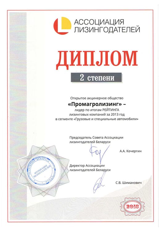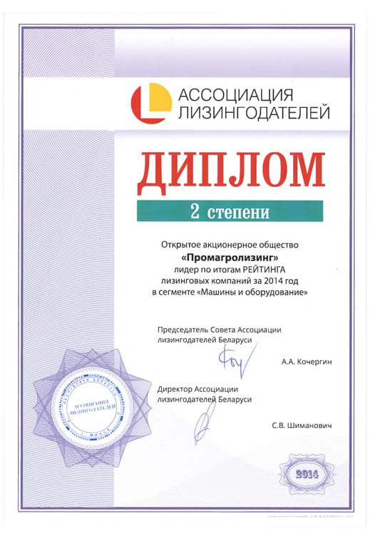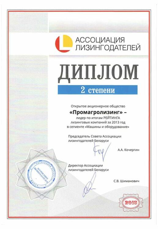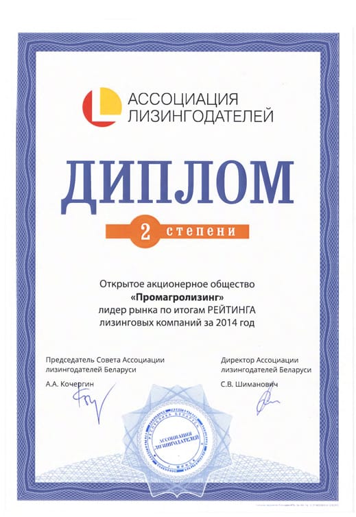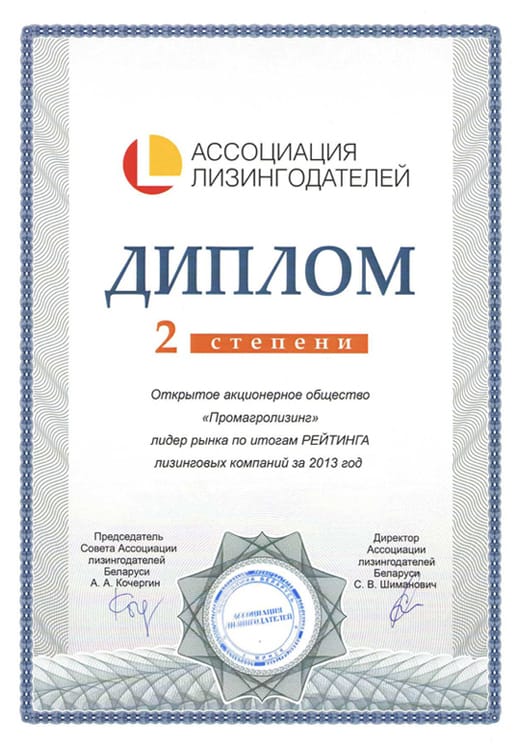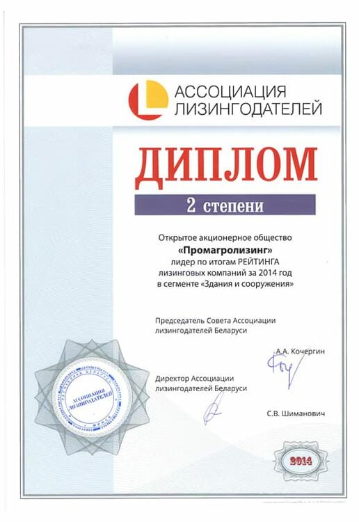 Диплом I степени ОАО "Промагролизинг" - "Лидер рынка по итогам рейтинга лизинговых организаций за 2024 год"