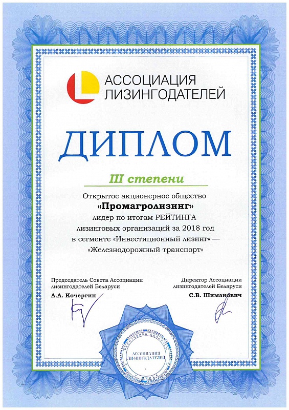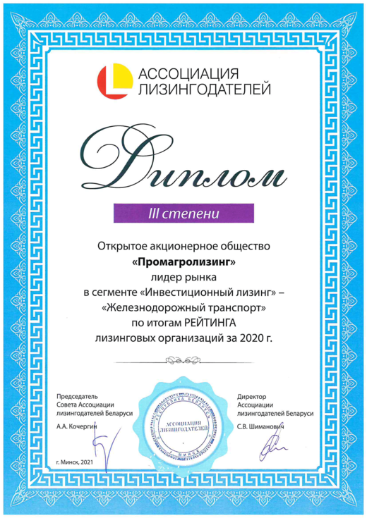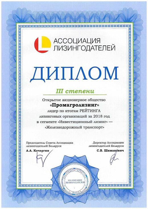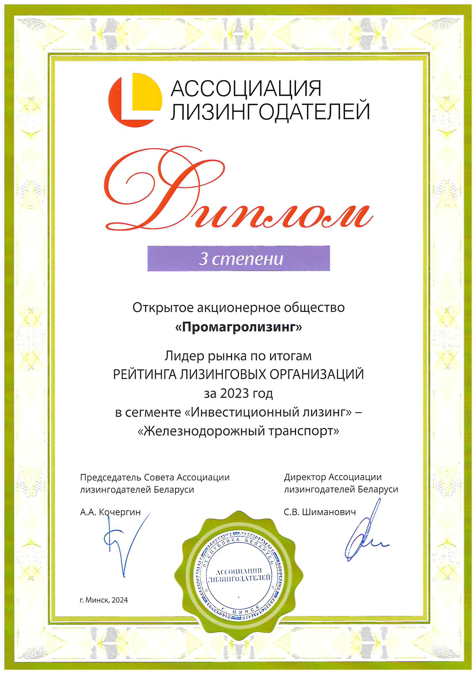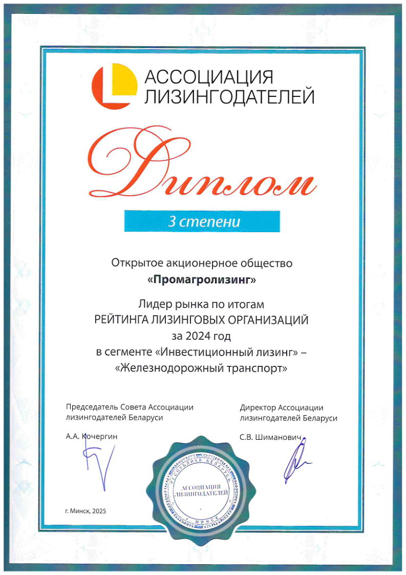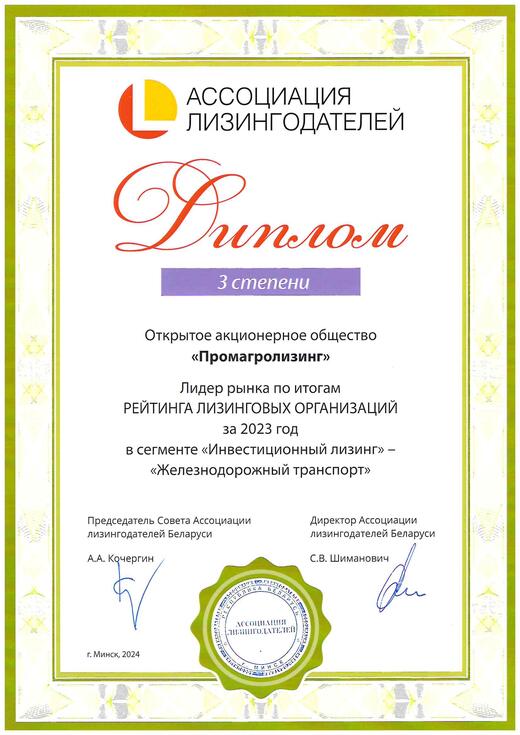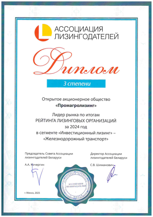 Диплом III степени ОАО "Промагролизинг" - Лидер рынка по итогам РЕЙТИНГА лизинговых организаций за 2024 год в сегменте "Инвестиционный лизинг" - "Железнодорожный транспорт"