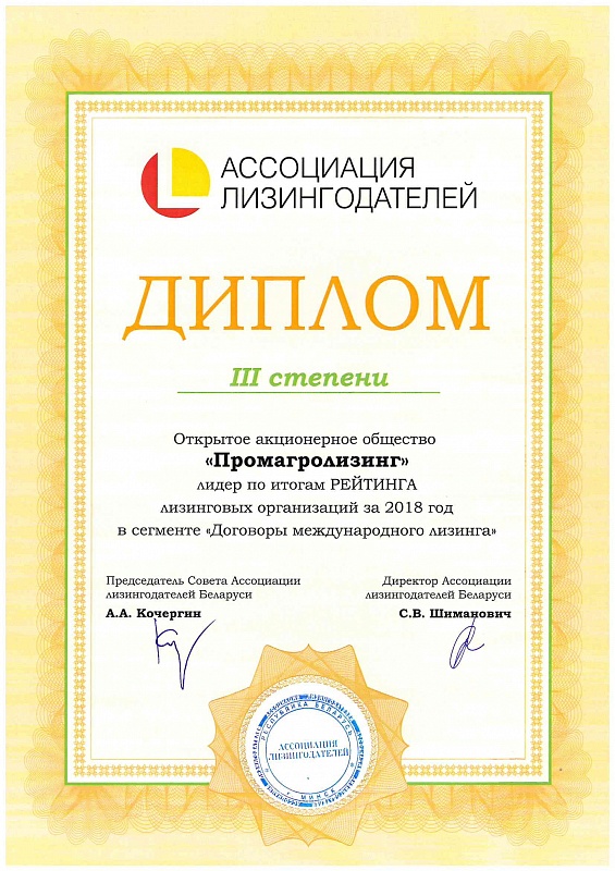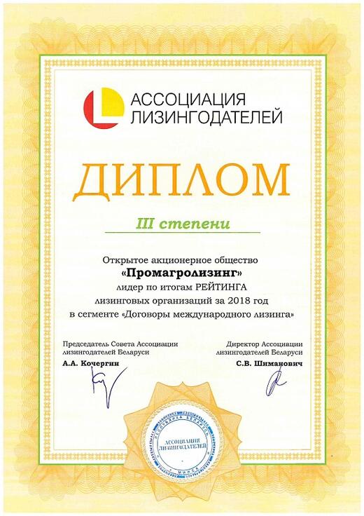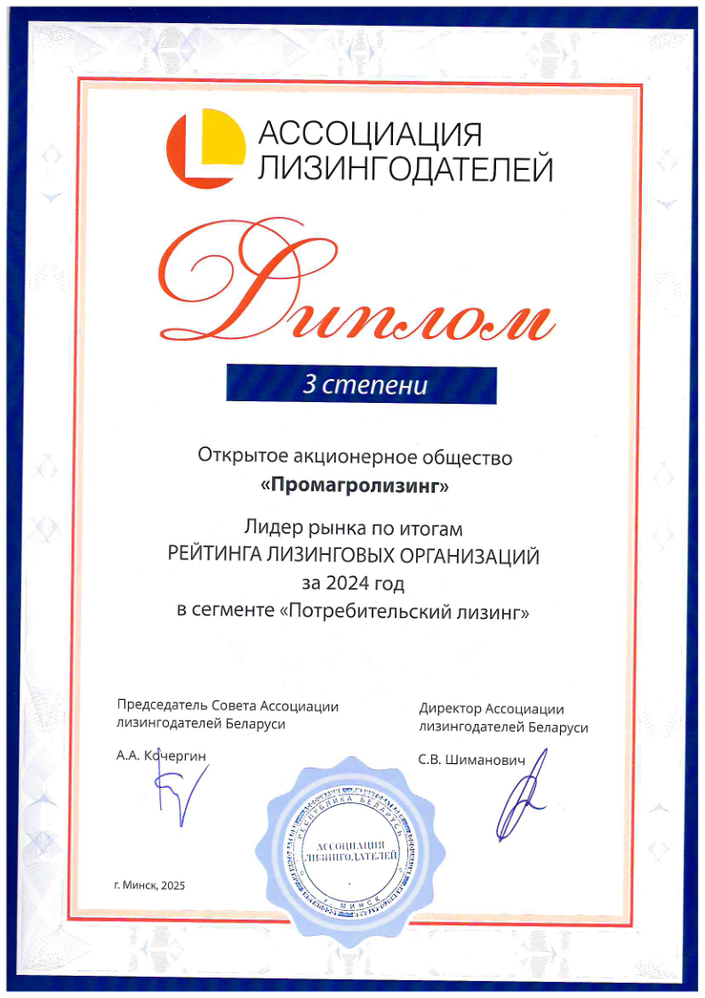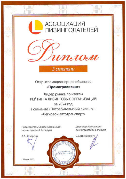Диплом III степени ОАО "Промагролизинг" - Лидер рынка по итогам РЕЙТИНГА лизинговых организаций за 2024 год в сегменте "Потребительский лизинг"