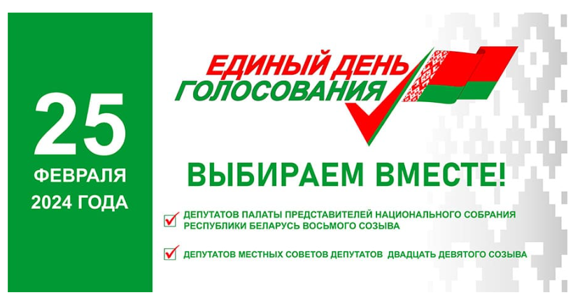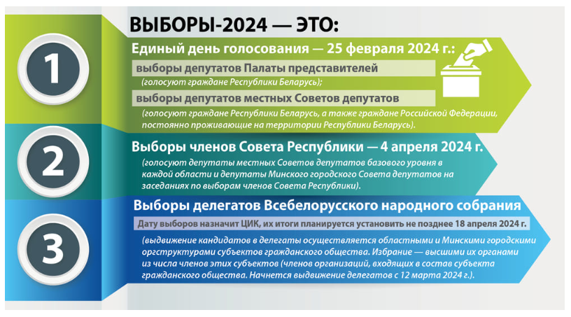 Единый день голосования в Беларуси пройдет 25 февраля 2024 года. Избираться будут депутаты Палаты представителей Национального собрания восьмого созыва и местных Советов депутатов двадцать девятого созыва. 4 апреля 2024 года пройдут выборы членов Совета Республики, затем — делегатов Всебелорусского народного собрания от субъектов гражданского общества и местных Советов депутатов.