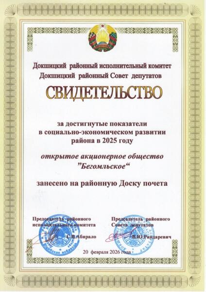 Кроме того, по итогам работы за прошедший год ОАО «Бегомльское» вошло в число лучших организаций района. В связи с высокими производственными и экономическими показателями коллектив предприятия в очередной раз заносится на районную Доску Почета.