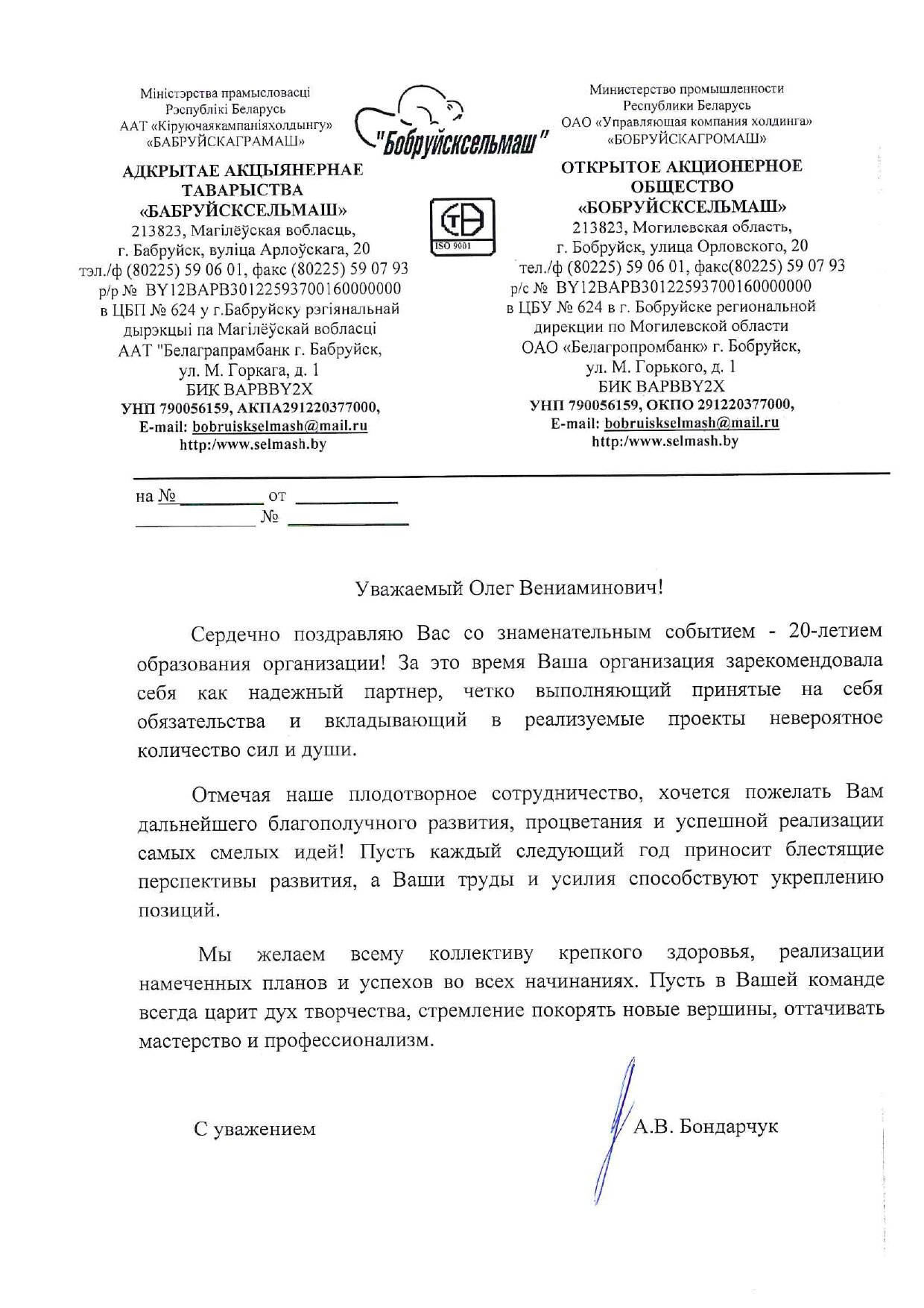 Общество получило поздравительные адреса от руководителей крупнейших машиностроительных заводов Беларуси: ОАО «Минский тракторный завод», ОАО «Управляющая компания холдинга «Бобруйскагромаш», ОАО «Бобруйсксельмаш», входящего в структуру холдинга «Бобруйскагромаш».