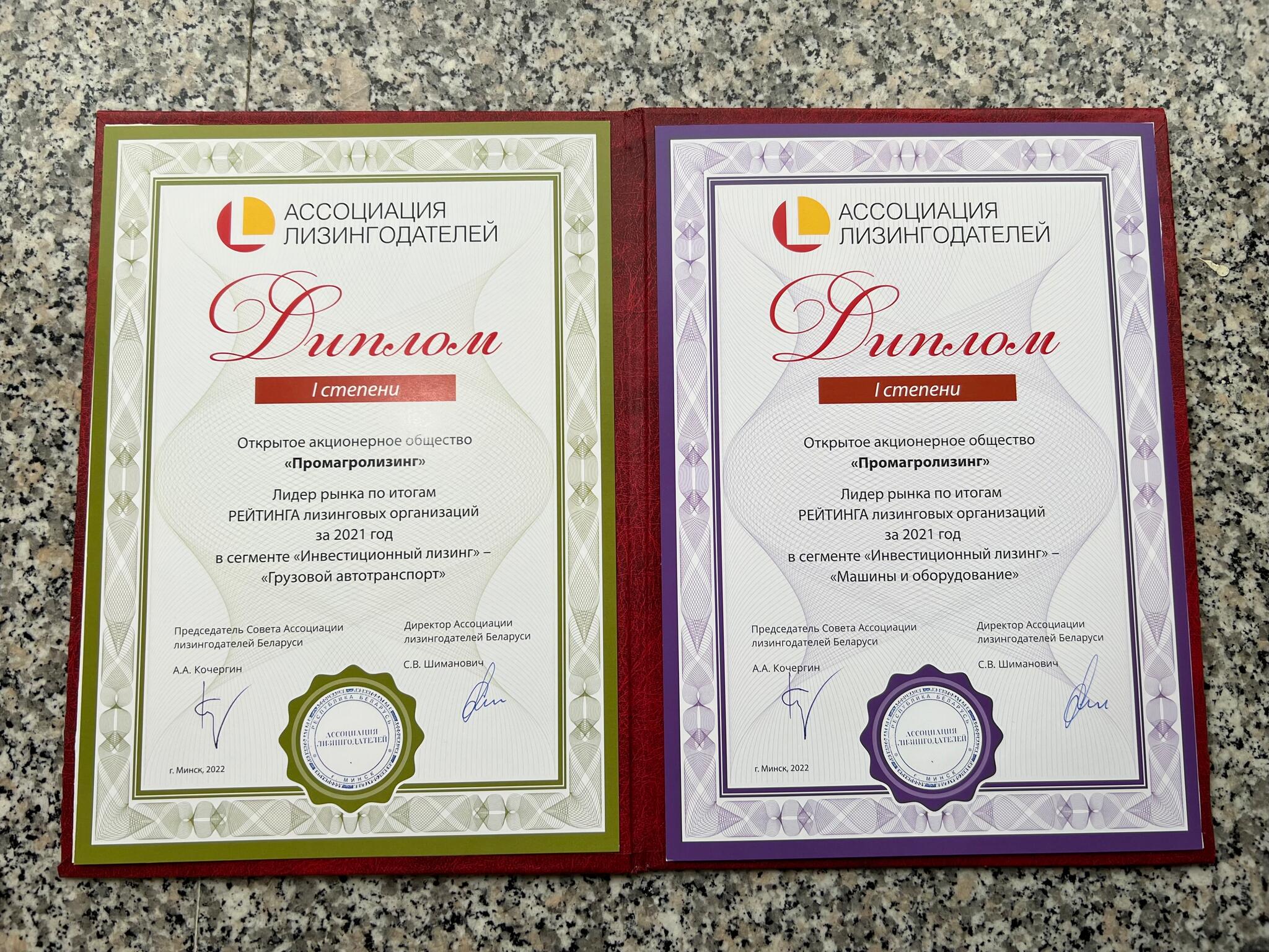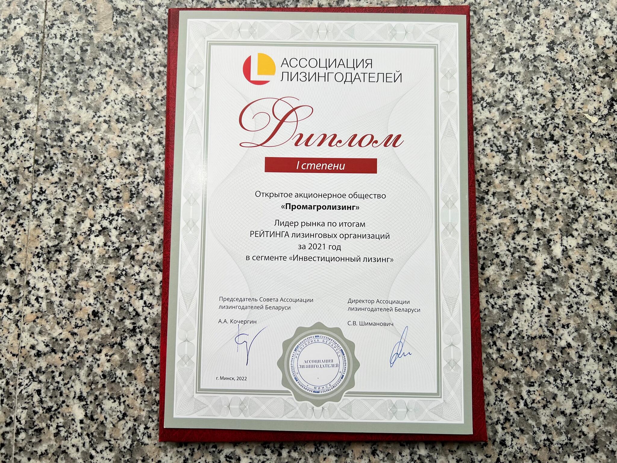 По итогам мероприятия ОАО «Промагролизинг» возглавило рейтинг лизинговых организаций Республики Беларусь за 2021 в сегменте «Инвестиционный лизинг», тем самым удержав лидерство на рынке лизинговых услуг нашей страны.